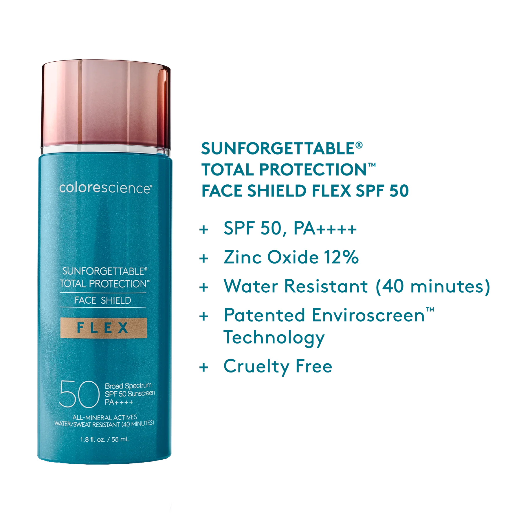 Meet your new everyday essential: Sunforgettable® Total Protection® Face Shield Flex SPF 50 – Fair. This lightweight liquid mineral sunscreen combines advanced EnviroScreen® Technology with skin-loving hydration for all-in-one coverage and defense.